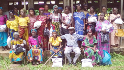 Center, Mr. Chris Nwadigo, flanked by the widows at the Fatima Secondary School Orieagu in Ehime Mbano Local Government Area of Imo State, yesterday. Photo by Chinonso Alozie.
